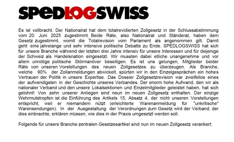 Es ist vollbracht. Der Nationalrat hat dem totalrevidierten Zollgesetz in der Schlussabstimmung vom 20. Juni 2025 zugestimmt. Beide Räte, also Nationalrat und Ständerat, haben dem Gesetz zugestimmt, womit die Totalrevision
